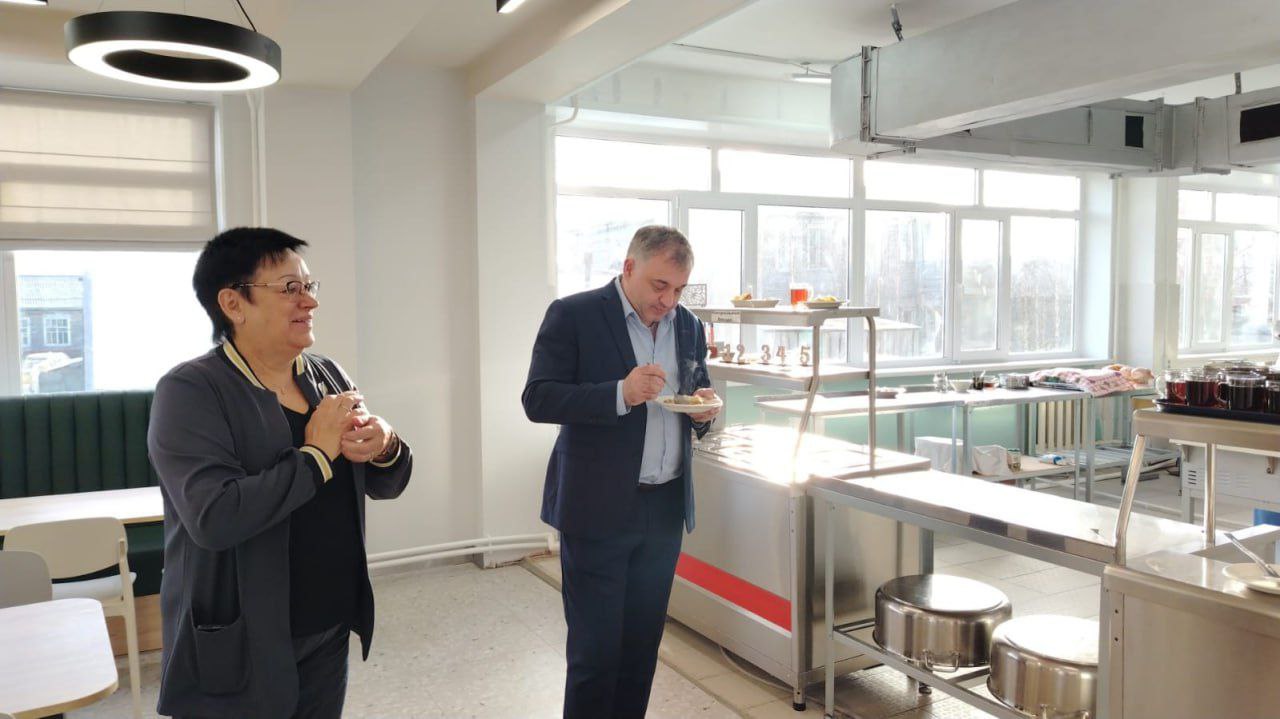 В рамках рабочего визита в Усть-Усу глава администрации Усинска вместе с коллегами осмотрел новое школьное кафе. Во время посещения руководитель округа пообщался с учащимися, чтобы узнать их впечатления от обновлённой столовой.