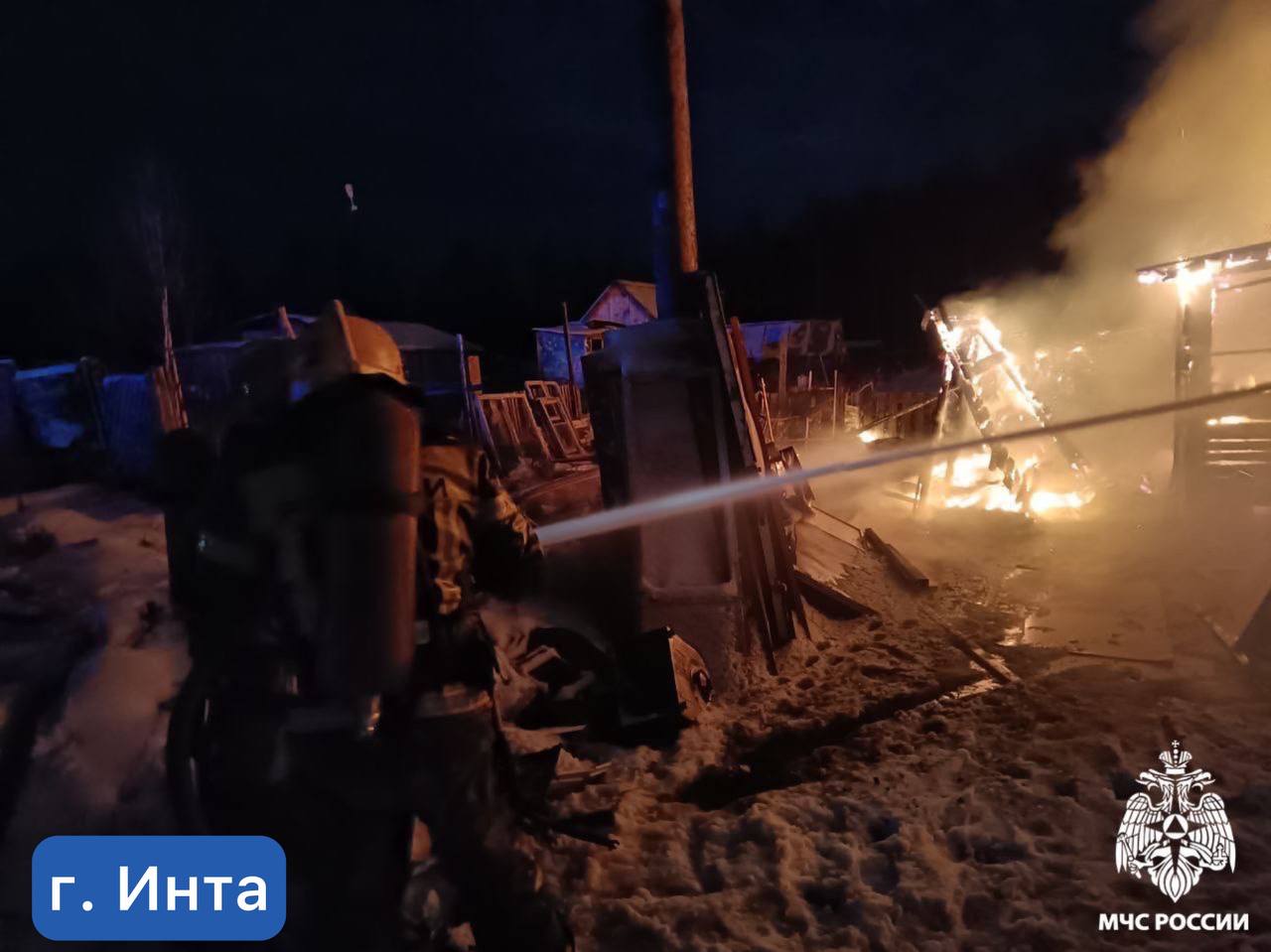 Первый вызов поступил из города Инта, где загорелась хозяйственная постройка на улице Угольная. Пламя было локализовано и ликвидировано на площади в 35 квадратных метров. В операции по тушению участвовали девять огнеборцев и три единицы специализированной техники. Предварительной причиной данного возгорания было названо нарушение требований пожарной безопасности при эксплуатации отопительной печи.