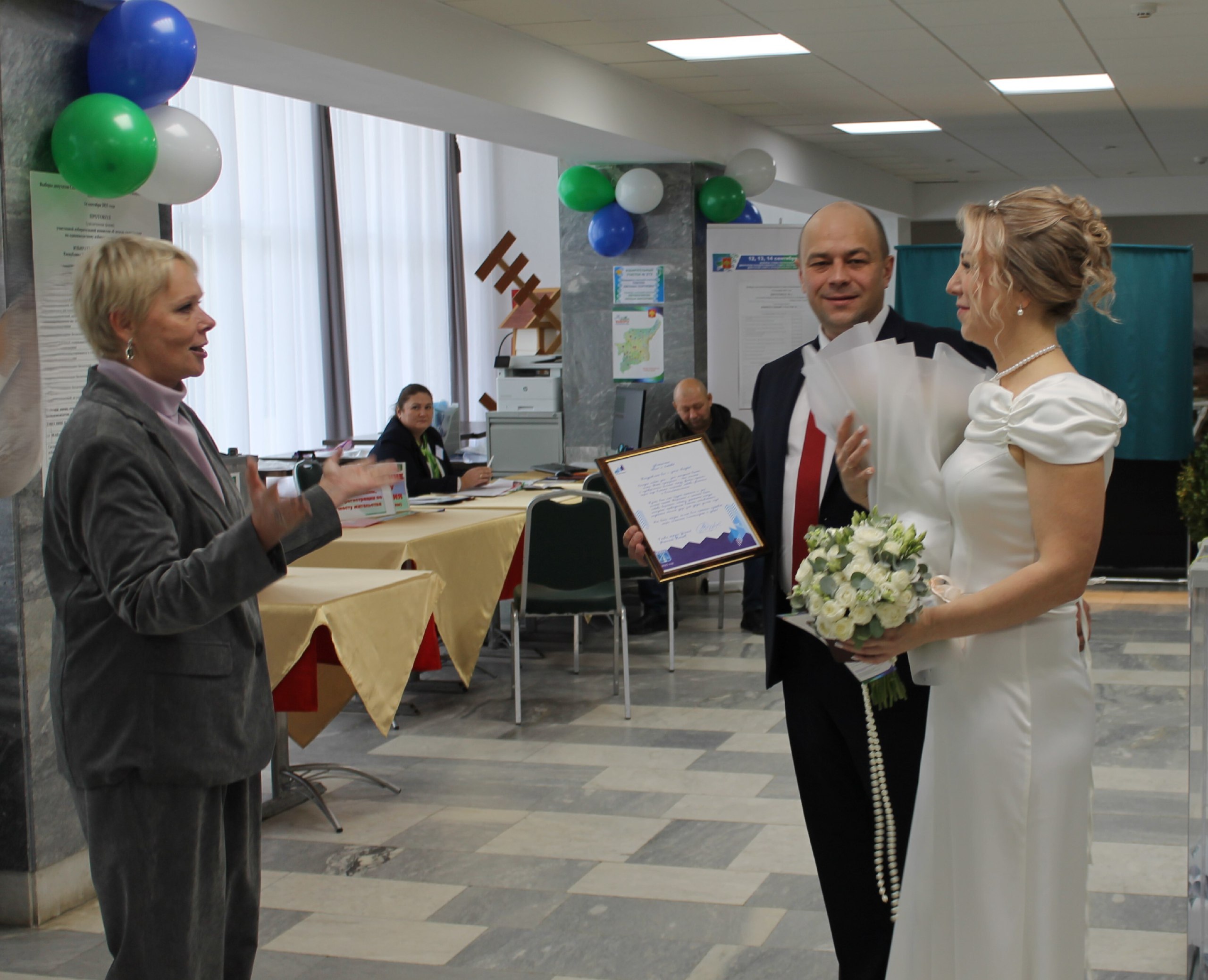 От имени Николая Такаева супругов поздравила заместитель главы администрации Ирина Виряльченкова. Она поблагодарила молодую пару за сознательность и пожелала им крепкого семейного счастья, взаимопонимания, благополучия и радости в новом совместном пути.