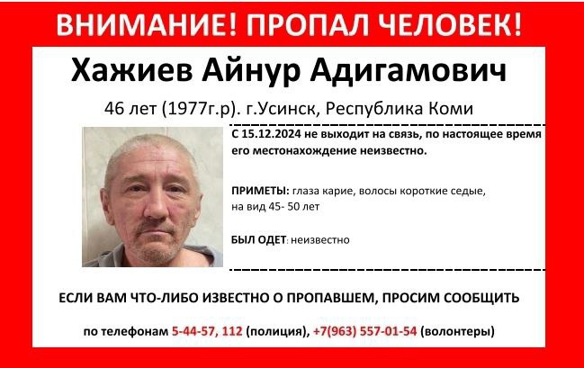 В Коми продолжаются поиски 46-летнего Айнура Хажиева, ориентировки с приметами которого распространили волонтеры. Мужчина среднего роста с карими глазами и короткими седыми волосами выглядит на 45-50 лет. Информация о его одежде в день пропажи, к сожалению, отсутствует, что усложняет его поиск.
