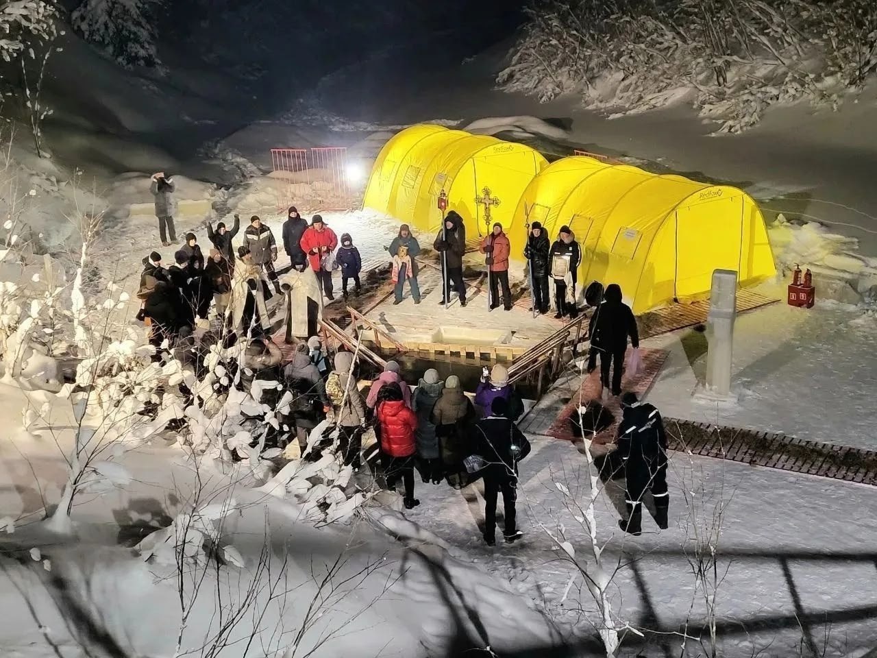 Непосредственно на площадке дежурили спасательные службы, медицинские работники, сотрудники полиции и народные дружинники. Для того чтобы участники могли согреться после погружения, были установлены тёплые палатки, где предлагали горячий чай. Возможность совершить омовение сохранялась до позднего вечера.